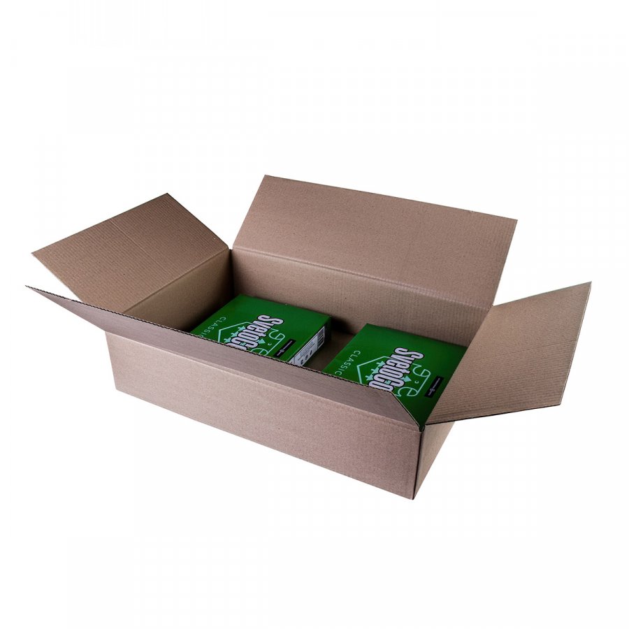 - Подходит как для упаковки бытовой химии, так и пищевых продуктов. В пустом виде картонный гофрокороб легко и удобно складывается. Выполнен из трехслойного гофрокартона марки Т-23 бурого цвета.