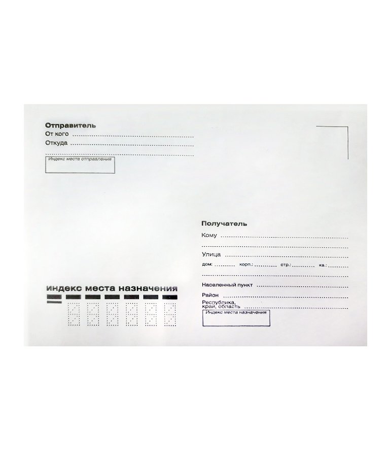 - Конверт почтовый C6, размер 114x162 мм с адресной сеткой "Куда-Кому" — используется для отправки частных писем, открыток, квитанций, деловой корреспонденции, рекламных рассылок и других типов документов.