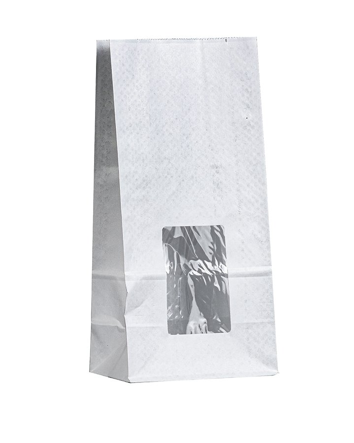 - Двухслойные белые крафт пакеты 120x80x250 мм с окном используются для упаковки чая, кофе, какао, сладостей, орехов и других сыпучих продуктов.