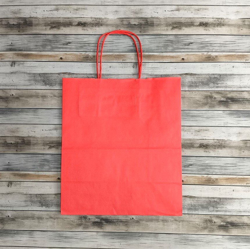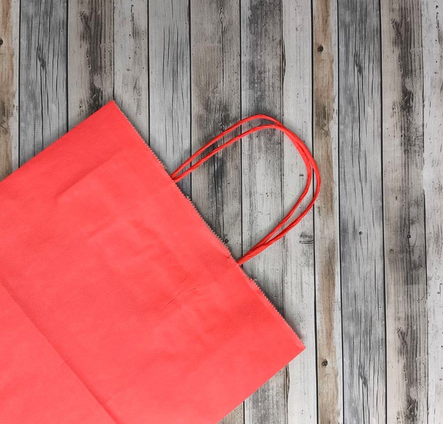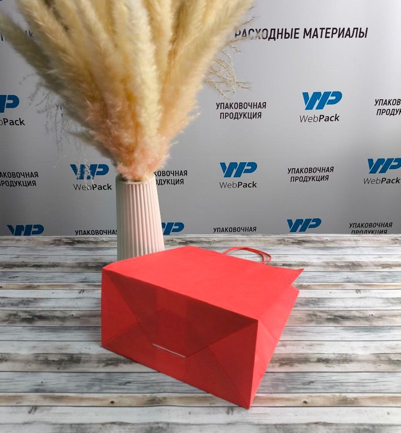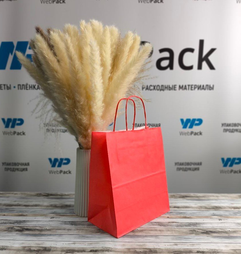 - Бумажные крафт пакеты красного цвета с кручеными ручками, размер 22x12x25 см.