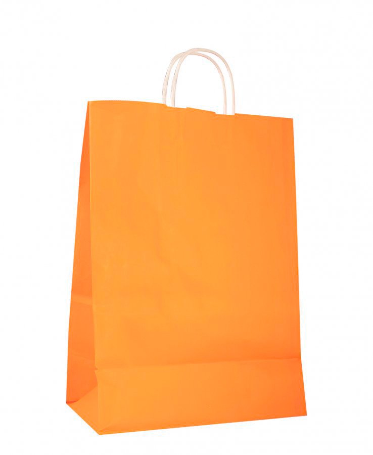 - Оранжевые бумажные крафт пакеты с кручеными ручками, размер 25x11x32 см.