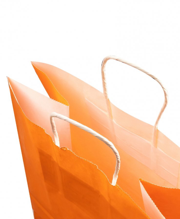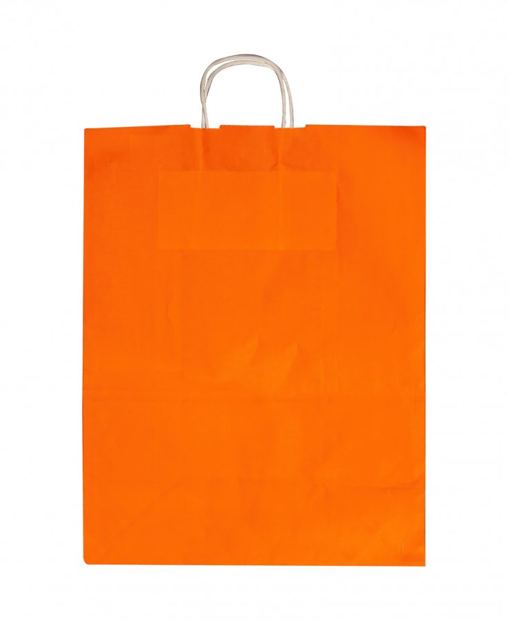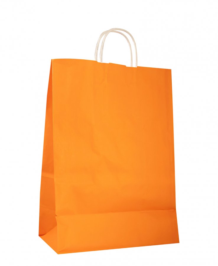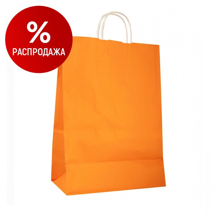 - Оранжевые бумажные крафт пакеты с кручеными ручками, размер 22x13x32 см.