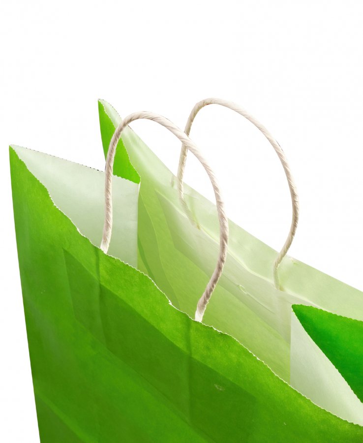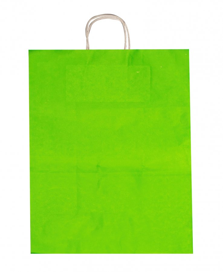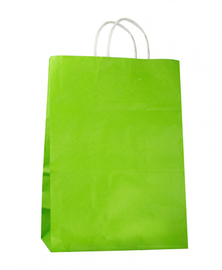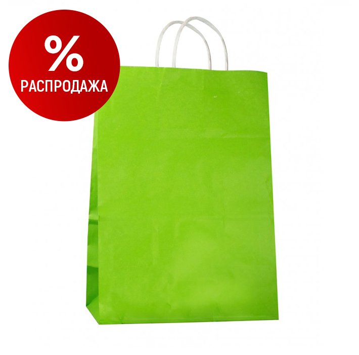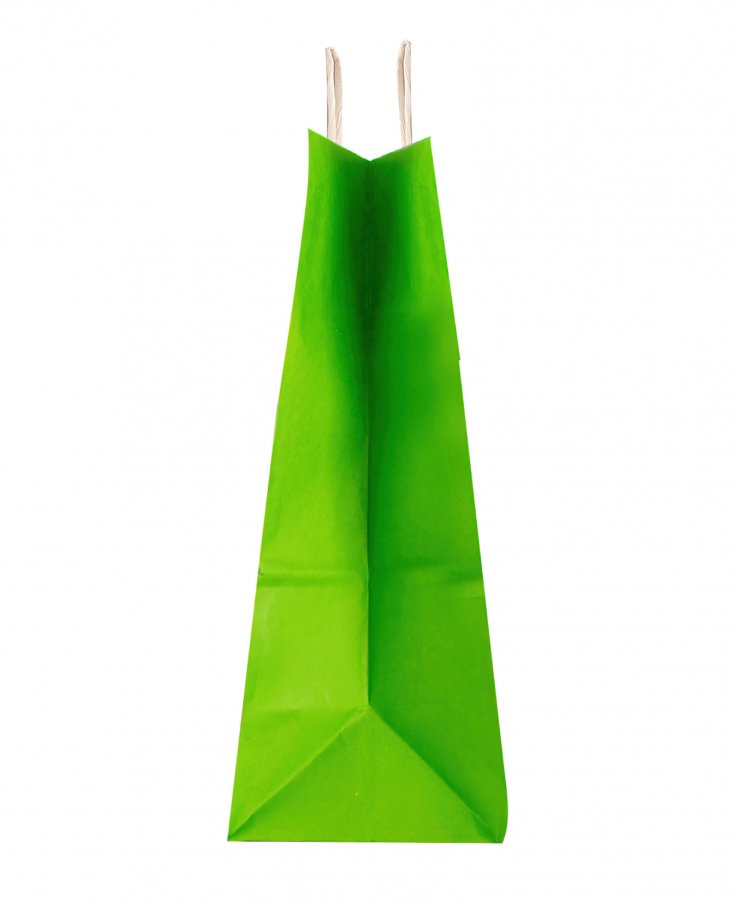 - Зеленые бумажные крафт пакеты с кручеными ручками, размер 22x13x32 см.