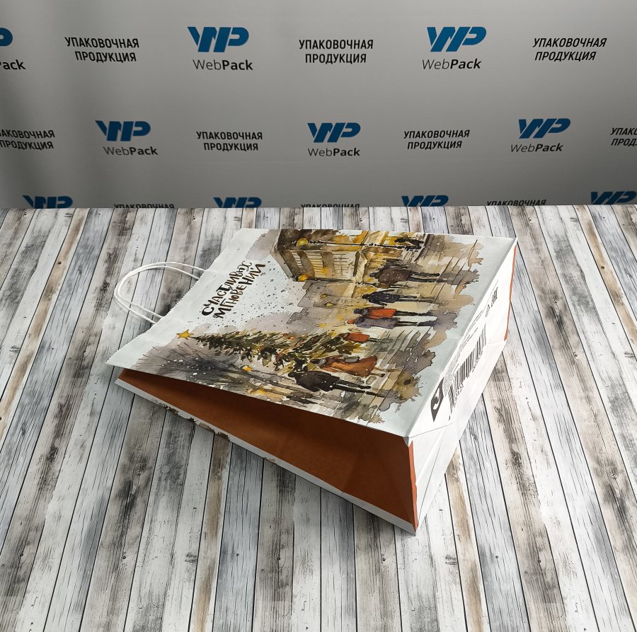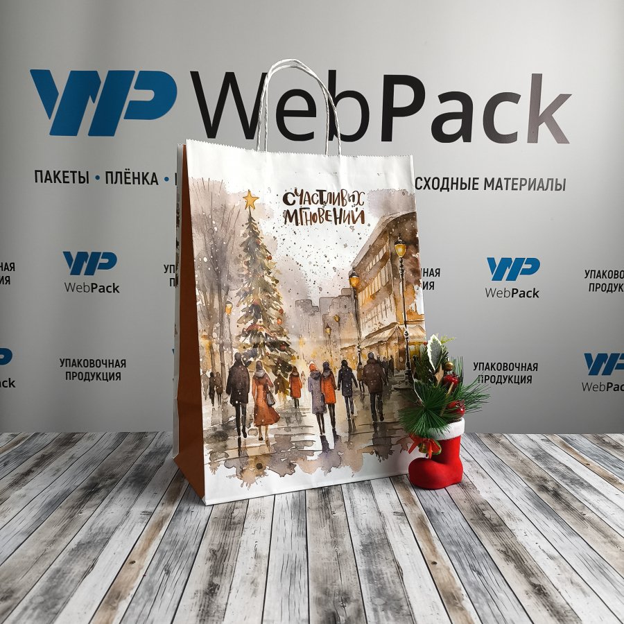 Крафт-пакеты с рисунком "Счастливые мгновения" 35x26x15 см отлично подходят для упаковки подарков, сувениров и других различных товаров.