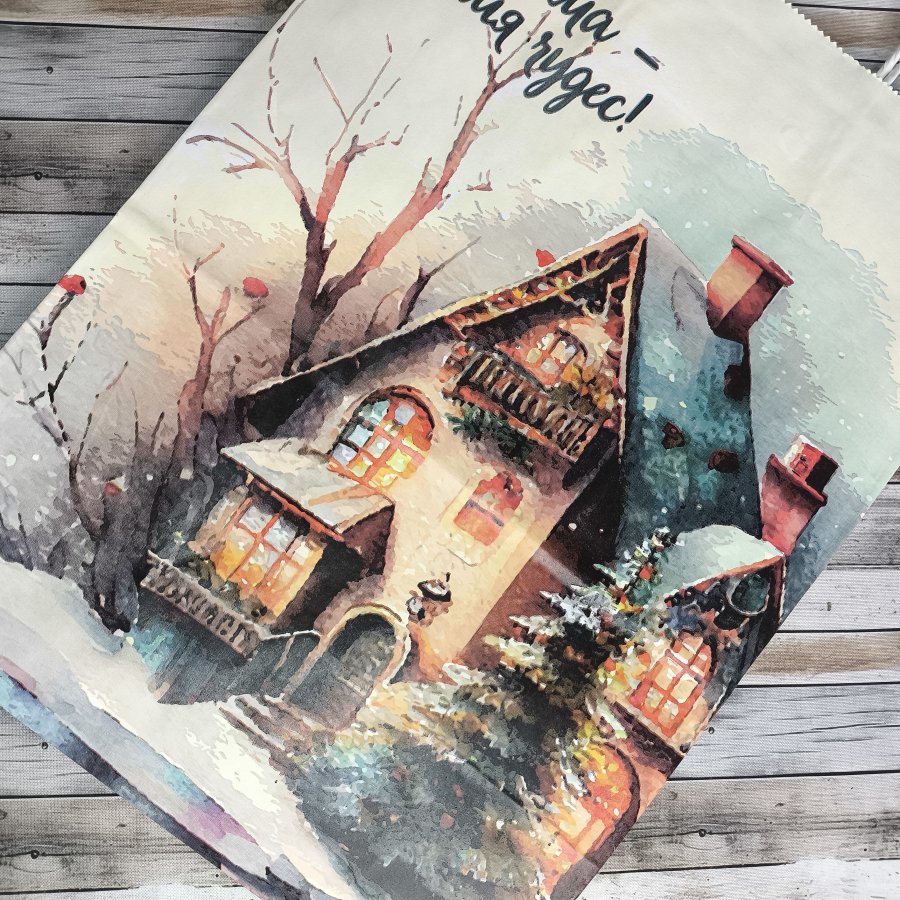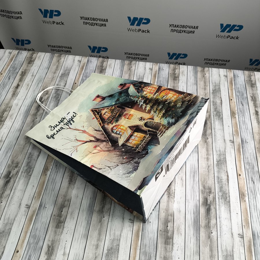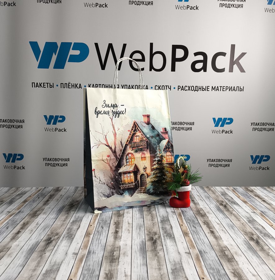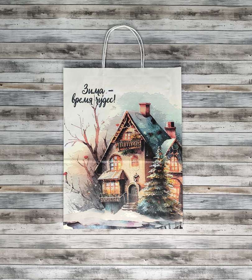 Крафт-пакеты "Время чудес" с новогодним рисунком 35x26x15 см отлично подходят для упаковки подарков, сувениров и других различных товаров.