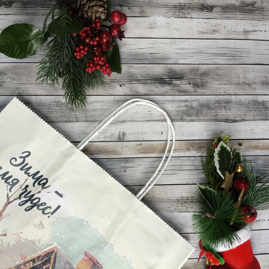 Кручёные ручки обеспечивают удобство переноски. Прямоугольное дно позволяет ставить пакет на ровную поверхность.