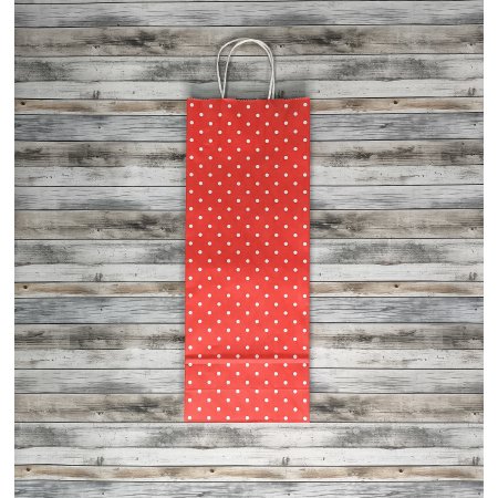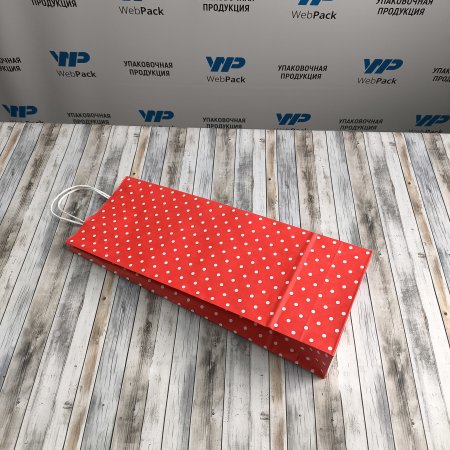 - Крафт пакеты красного цвета с рисунком горох, размер 39x15x8 см. В пакетики можно упаковать вино, напитки или сувениры.