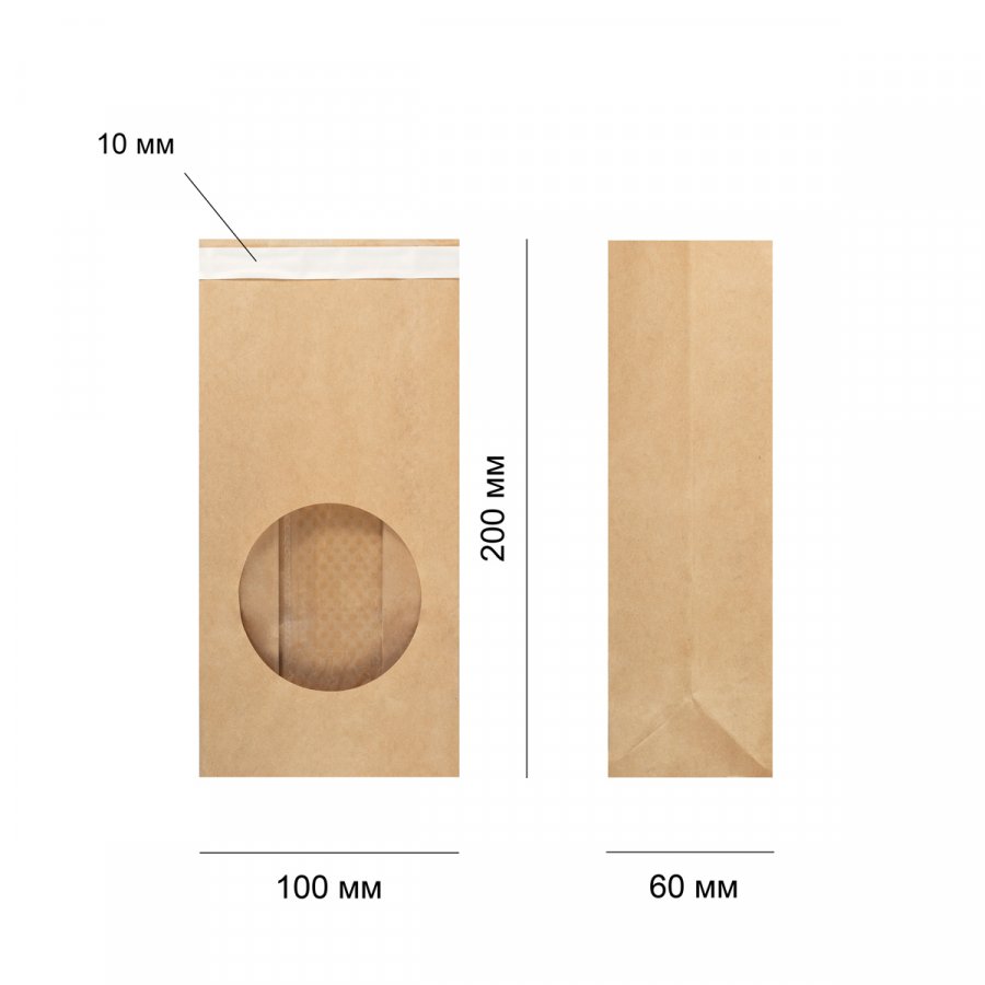 Крафт пакет с круглым окном 100*60*200 мм, 70 г/м2 (крафт), с клеевым клапаном (1 слой)