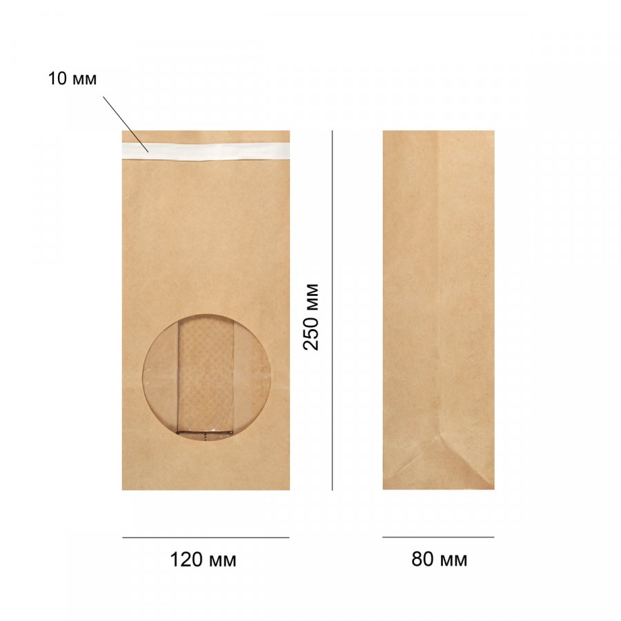 Крафт пакет с круглым окном 120*80*250 мм, 70 г/м2 (крафт), с клеевым клапаном (2 слоя)