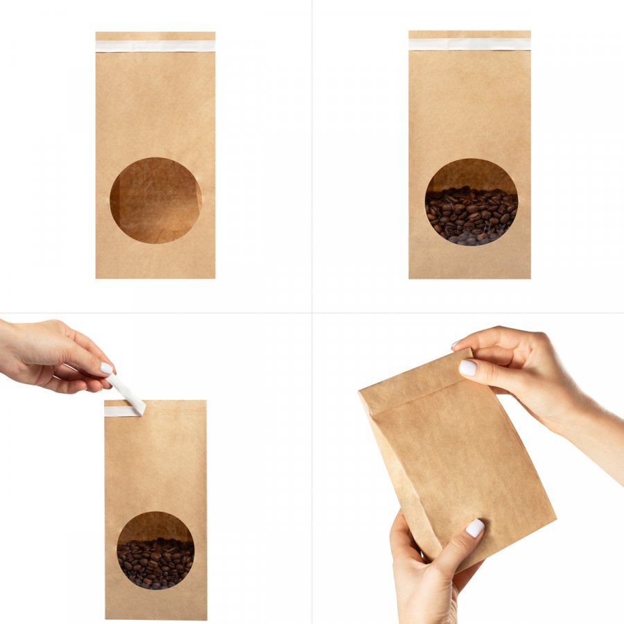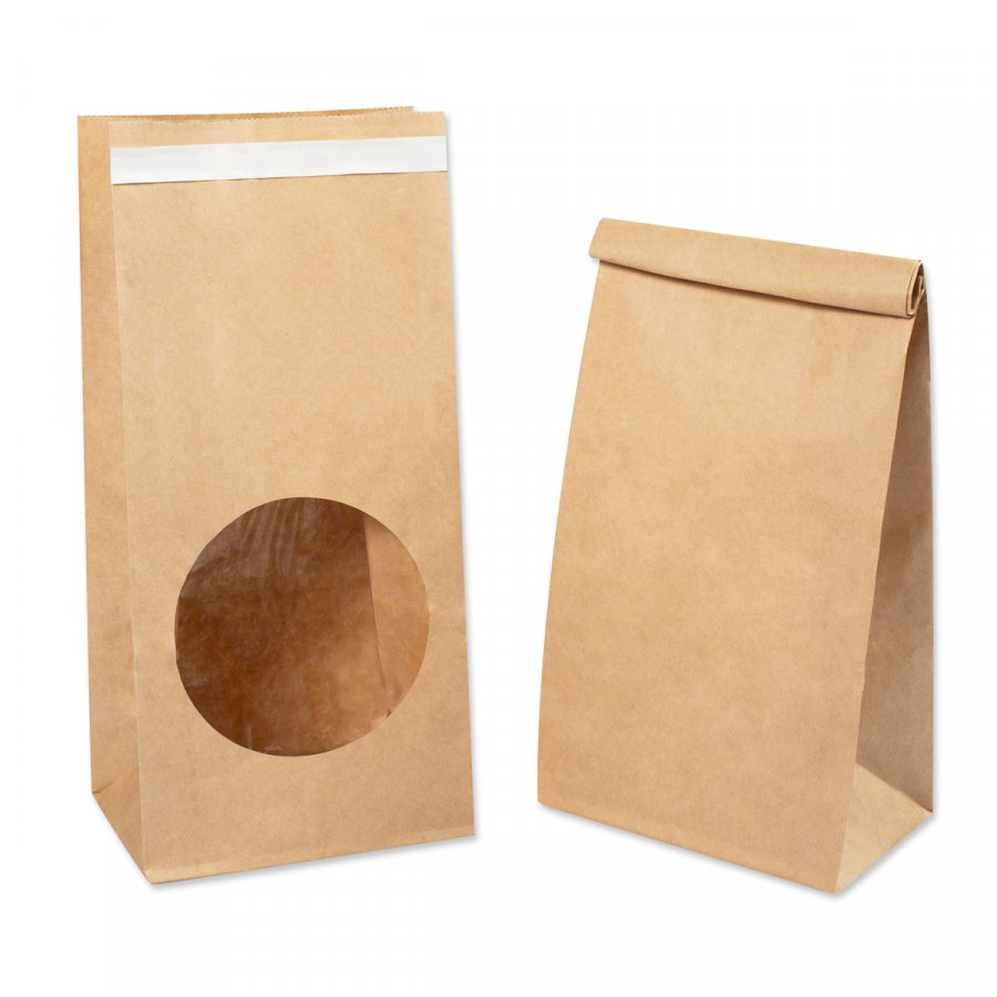 - Двухслойные крафтовые пакеты (размер 120x80x250 мм) с круглым прозрачным окошком. Закрываются с помощью клеевого клапана, который расположен вверху пакета. Изготовлены из бумаги бурого цвета плотностью 70 г/м2 со слоем ламинации.