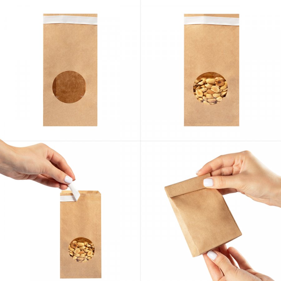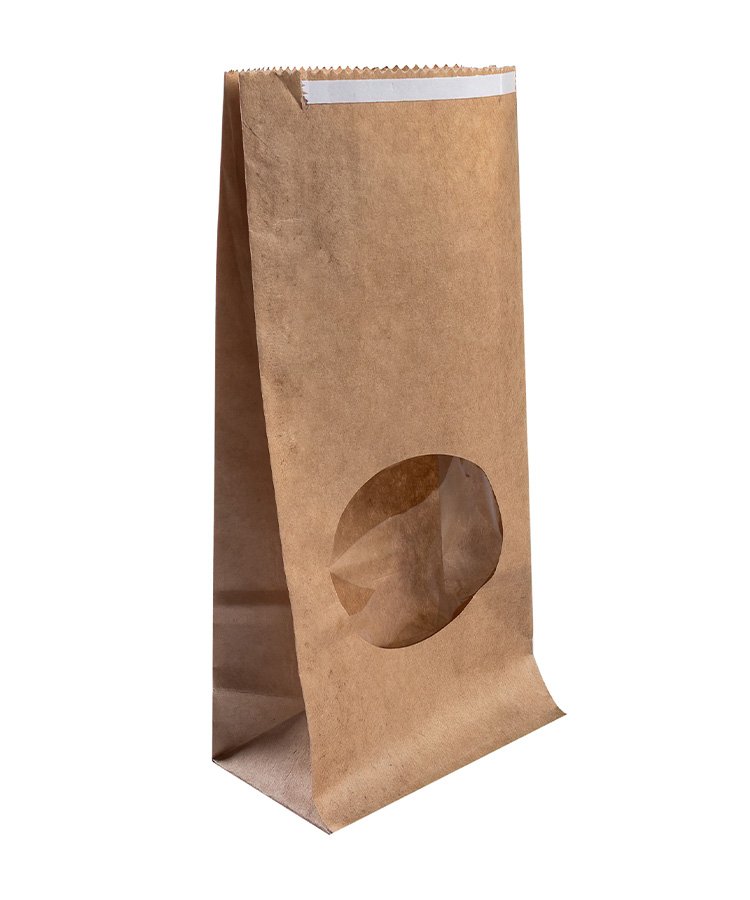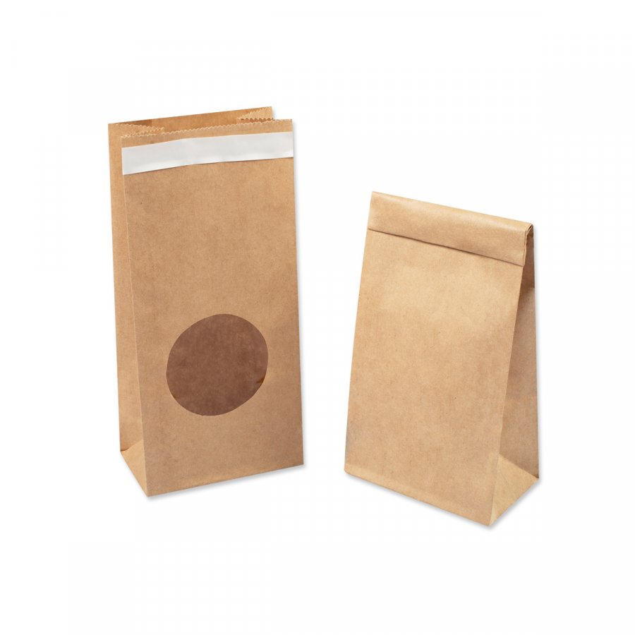 - Однослойные крафтовые пакеты без ручек (размер 80x50x170 мм) с круглым окошком. Вверху пакета расположен клеевой клапан. Изготовлены из бумаги бурого цвета плотностью 70 г/м2.