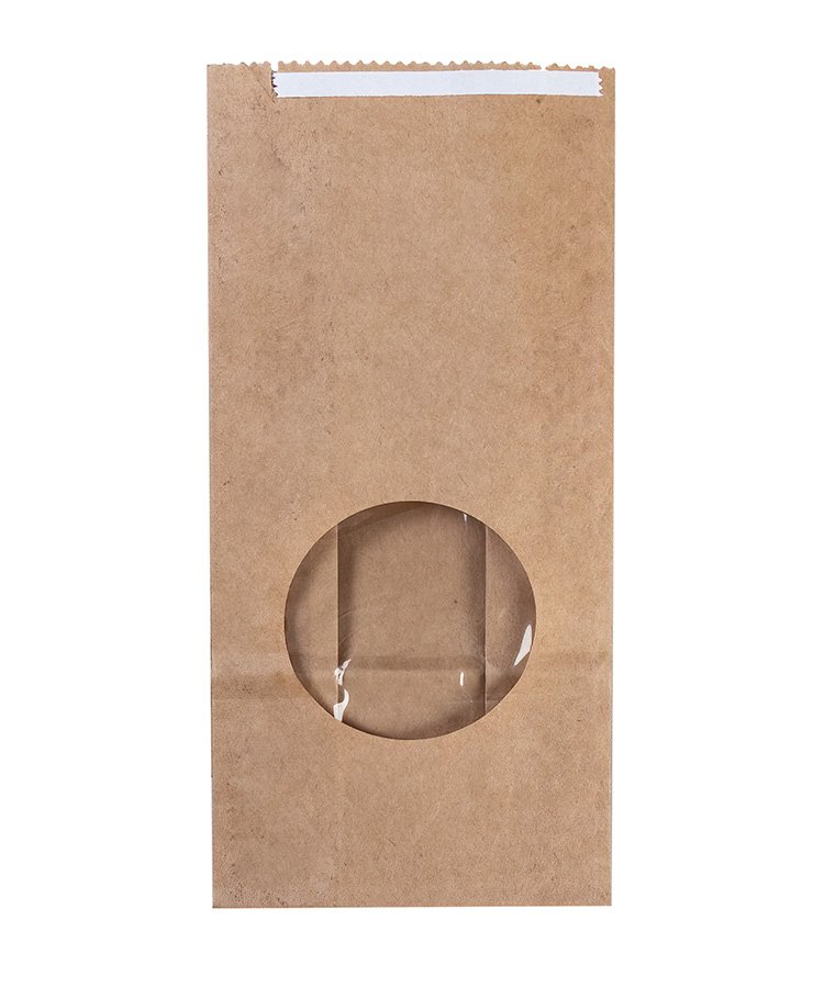 Крафт пакет с круглым окном 80*50*170 мм, 70 г/м2 (крафт), с клеевым клапаном (1 слой)