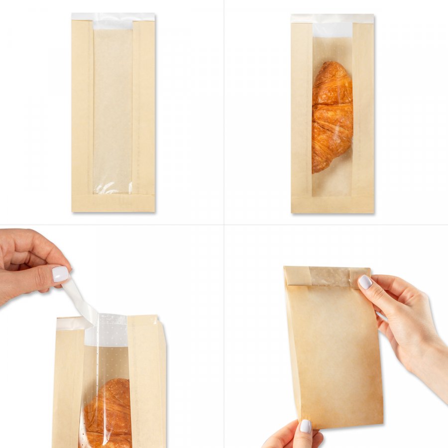 - Крафт-пакеты 110x40x260 мм с прозрачным окошком шириной 50 мм, V-образным дном и клеевым клапаном. Изготовлены из бумаги бежевого цвета плотностью 40 г/м2.