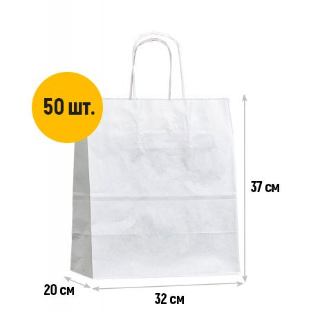 - Крафт пакеты белого цвета с кручеными ручками 320x200x370 мм - универсальные в применении, подходят для упаковки одежды, аксессуаров, подарков, продуктов и др.