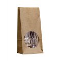- Двухслойные крафт пакеты 120x80x250 мм с окном используются для упаковки чая, кофе, какао, сладостей, орехов и других сыпучих продуктов.