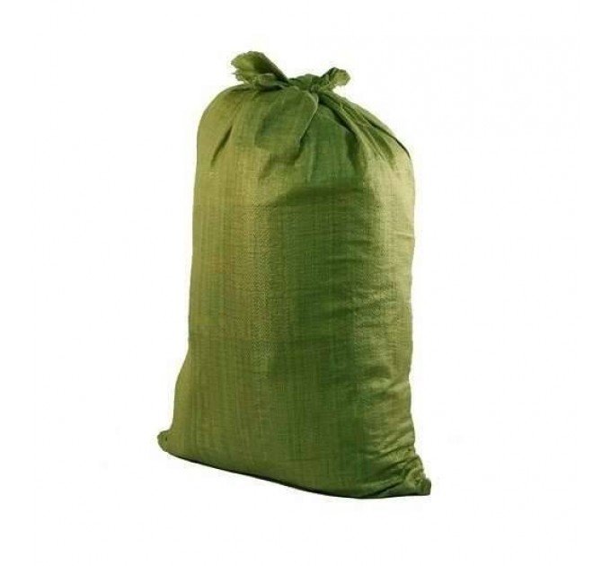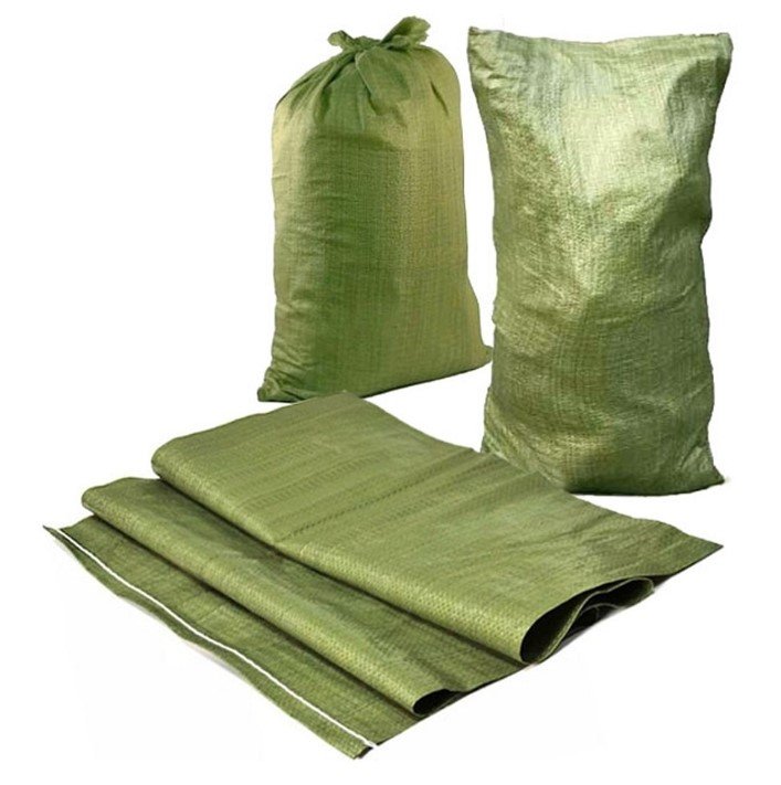 - Мешки полипропиленовые зеленого цвета из вторсырья. Длина — 90 см, высота — 130 см.