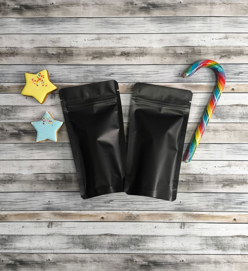 - Матовые пакеты дой-пак черного цвета, размер 105x195 мм, применяются для упаковки и хранения сыпучей продукции (кофе, чай, крупа, специи, орехи, сухофрукты, сладости, снэки, морская соль, скраб для тела, бытовая химия, корм для животных и др.).