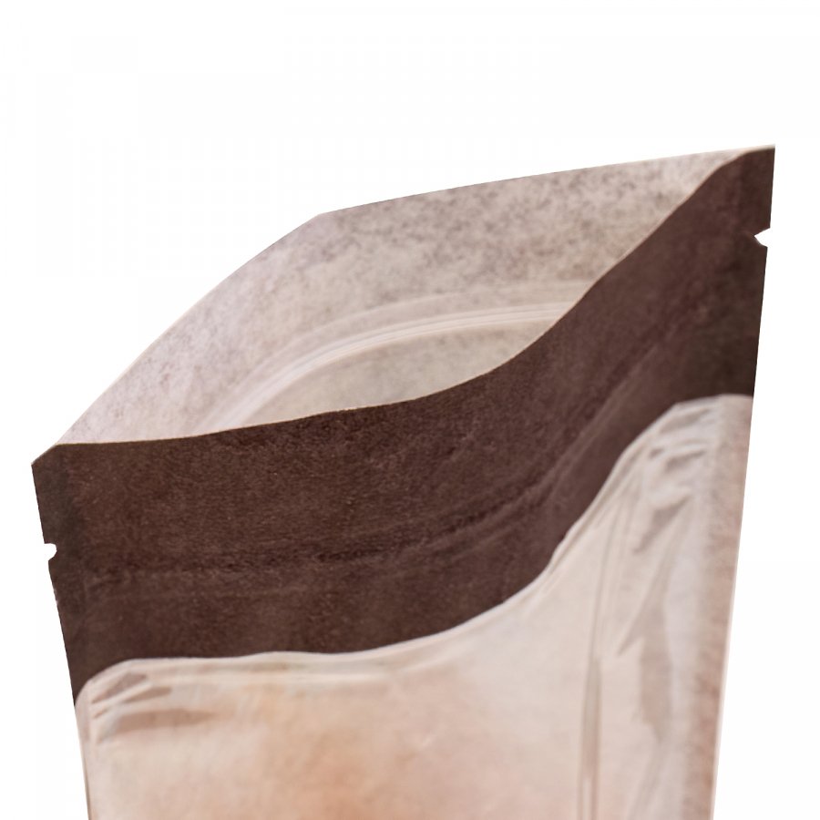 - Крафт пакеты дой-пак коричневого цвета с окном, размер 120x185 мм, применяются для упаковки и хранения сыпучей продукции (кофе, чай, крупы, специи, орехи, сухофрукты, сладости, снэки и др.).