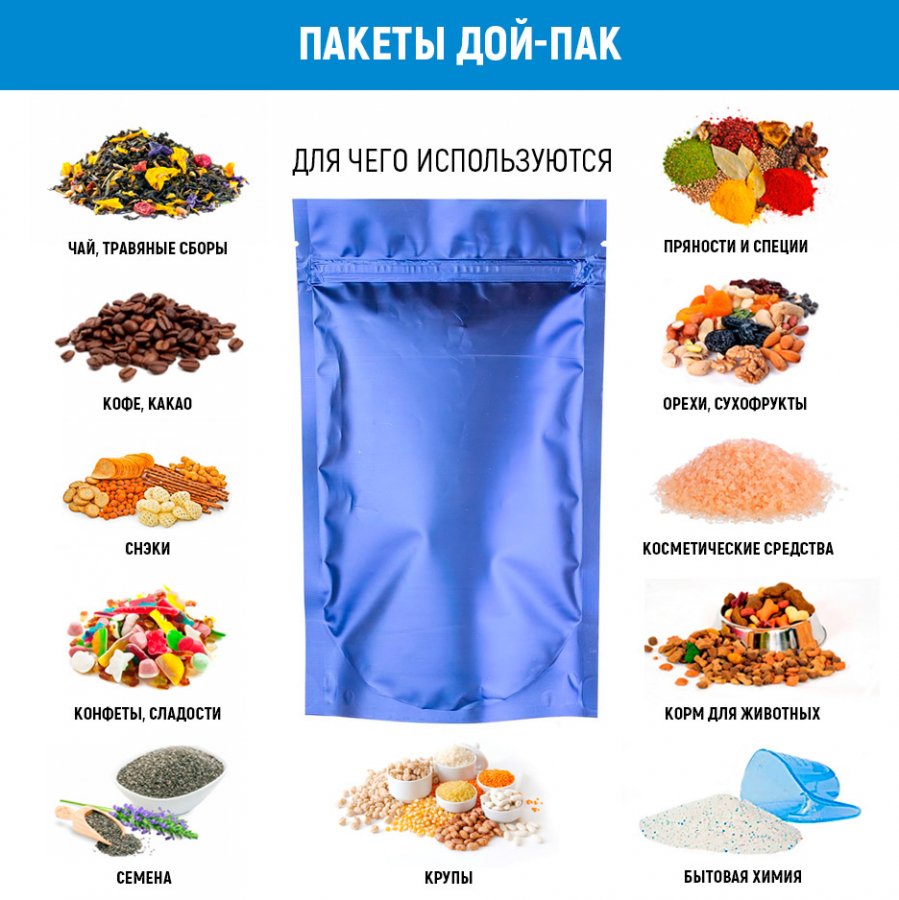 - Пакеты дой-пак фиолетово-синие матовые, размер 135*225(+40)мм, применяются для упаковки и хранения сыпучей продукции (кофе, чай, крупа, специи, орехи, сухофрукты, сладости, снэки, морская соль, скраб для тела, бытовая химия, корм для животных и др.).