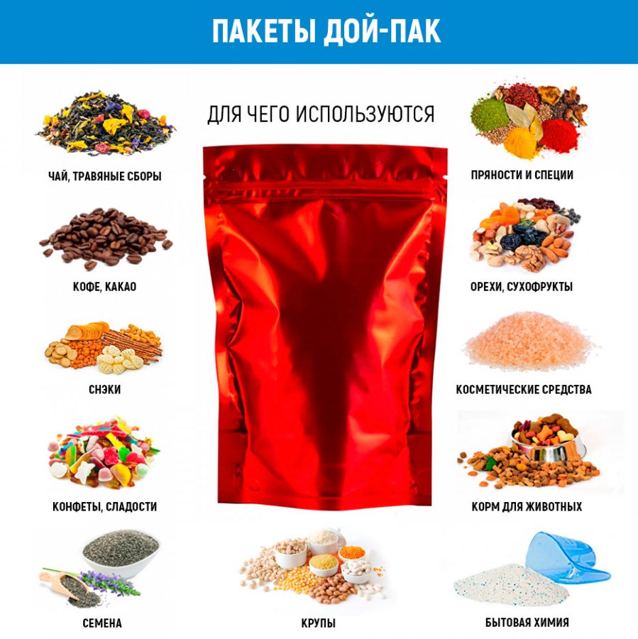 - Пакеты дой-пак красные матовые, размер 160*230(+45)мм, применяются для упаковки и хранения сыпучей продукции (кофе, чай, крупа, специи, орехи, сухофрукты, сладости, снэки, морская соль, скраб для тела, бытовая химия, корм для животных и др.).
