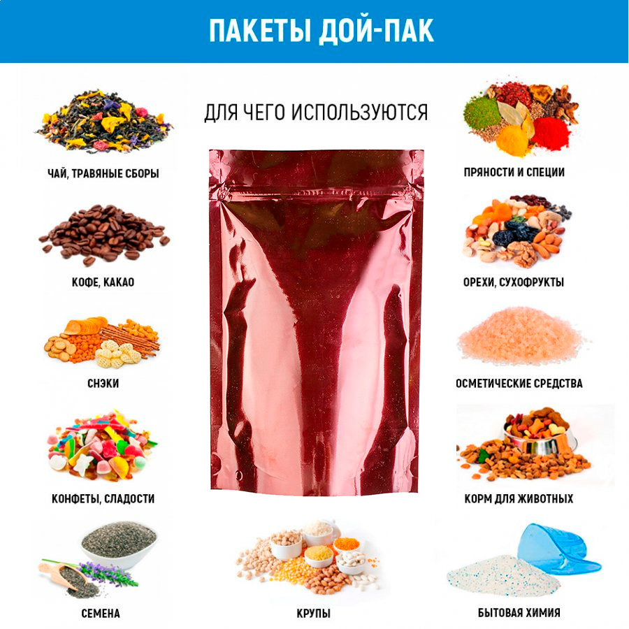 - Пакеты дой-пак бордового цвета, внешний размер 160*250(+45)мм, применяются для упаковки и хранения сыпучей продукции (кофе, чай, крупа, специи, орехи, сухофрукты, сладости, снэки, морская соль, скраб для тела, бытовая химия, корм для животных и др.).