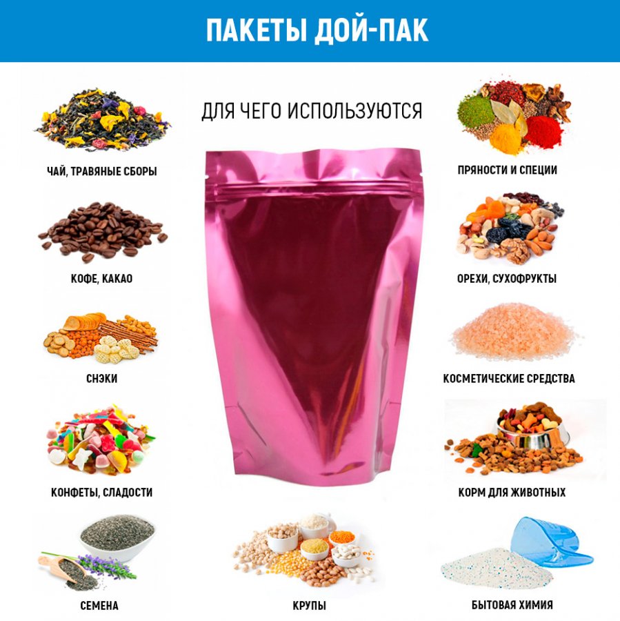 - Пакеты дой-пак фиолетового цвета, размер 160*250(+45)мм, применяются для упаковки и хранения сыпучей продукции (кофе, чай, крупа, специи, орехи, сухофрукты, сладости, снэки, морская соль, скраб для тела, бытовая химия, корм для животных и др.).