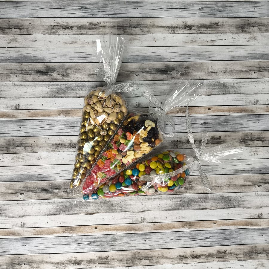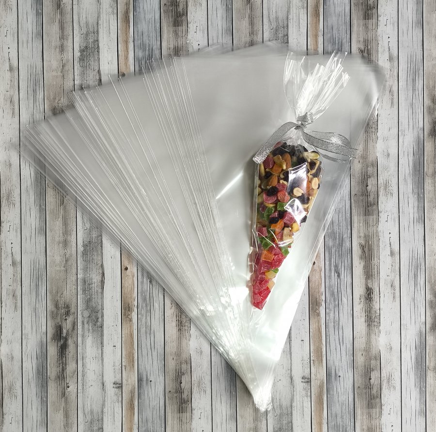 - Прозрачный пакет-конус в виде треугольника. Размер 25x40 см, толщина 30 мкм.