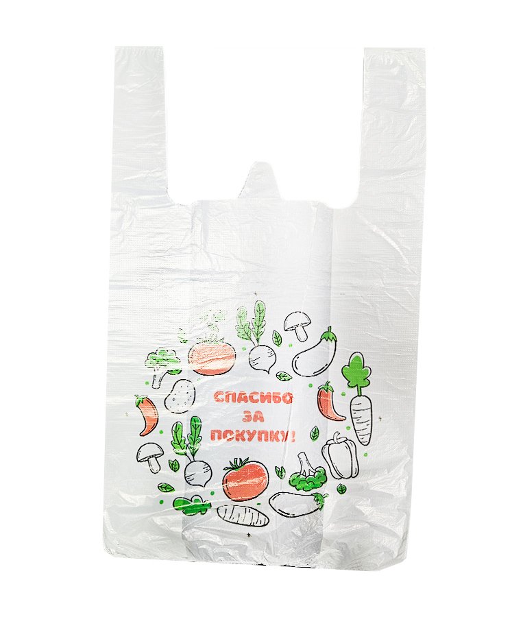 - Пакеты-майка с надписью "Спасибо за покупку" и рисунком "Овощи", размер 27x48 см, толщина 10 мкм. Используются в магазинах и супермакетах для упаковки различных товаров.