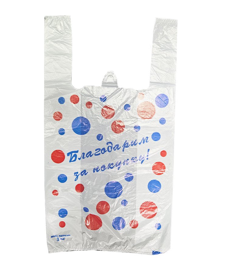Пакеты-майка с надписью "Благодарим за покупку", размер 27x48 см, толщина 10 мкм. Есть боковые фальцы. Используются в магазинах и супермакетах для упаковки различных товаров (одежды, обуви, техники, канцелярии и др.).