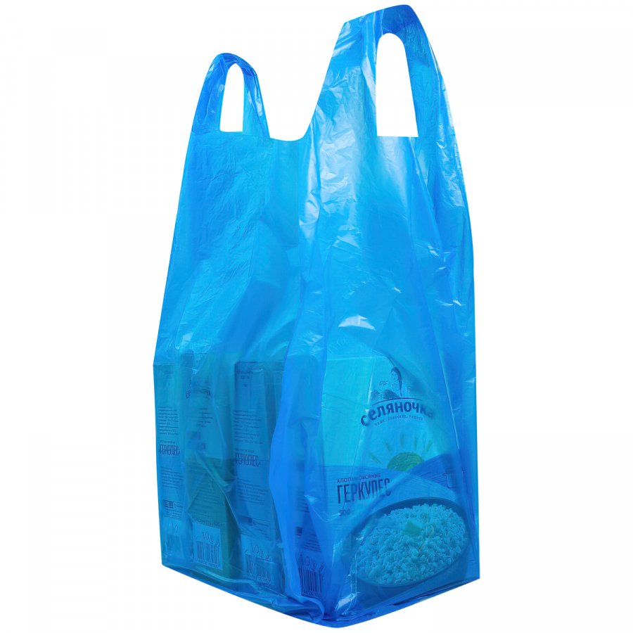 - Пакеты-майка синего цвета, размер 38x65 см, толщина 15 мкм. Используются в магазинах и супермакетах для упаковки различных товаров (одежды, обуви, техники и др.).