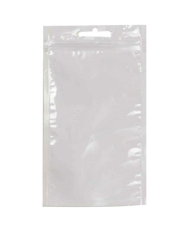 - Пакеты трехшовные ПЭТ/ПЭ (размер 100x180 мм, толщина 62 мкм) с европодвесом и замком зип-лок. Одна сторона выполнена из прозрачной пленки, вторая из белой.