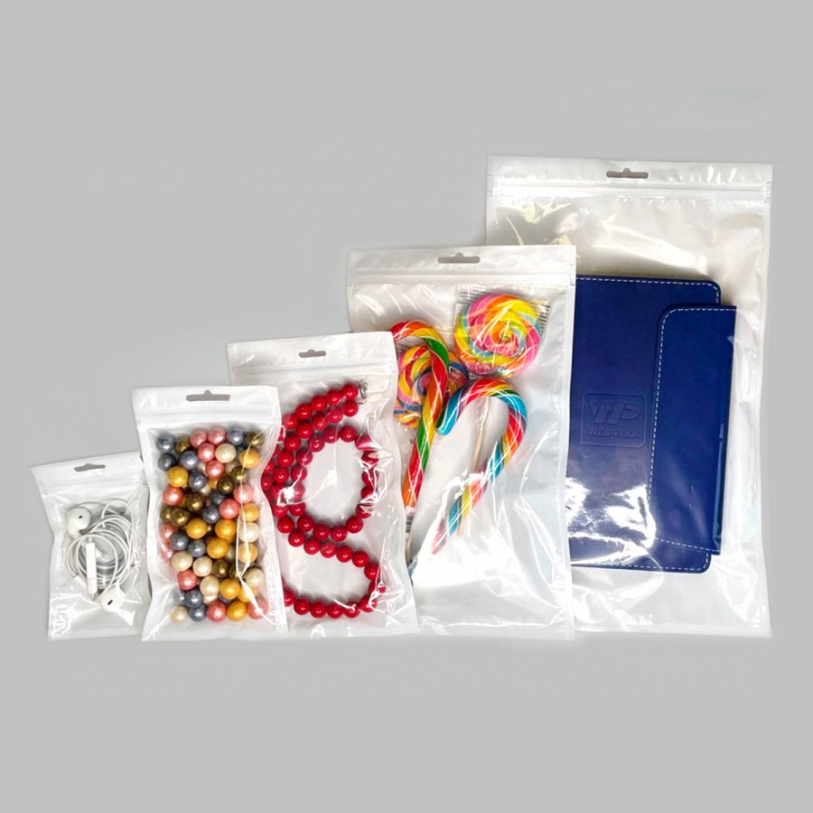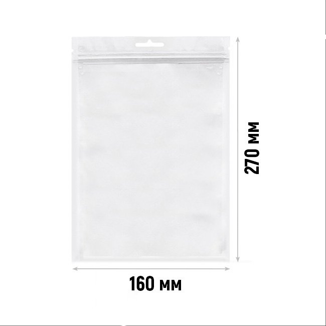 - Пакеты трехшовные ПЭТ/ПЭ (размер 160x270 мм, толщина 62 мкм) с европодвесом и замком зип-лок. Одна сторона выполнена из прозрачной пленки, вторая из белой.