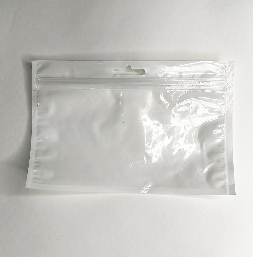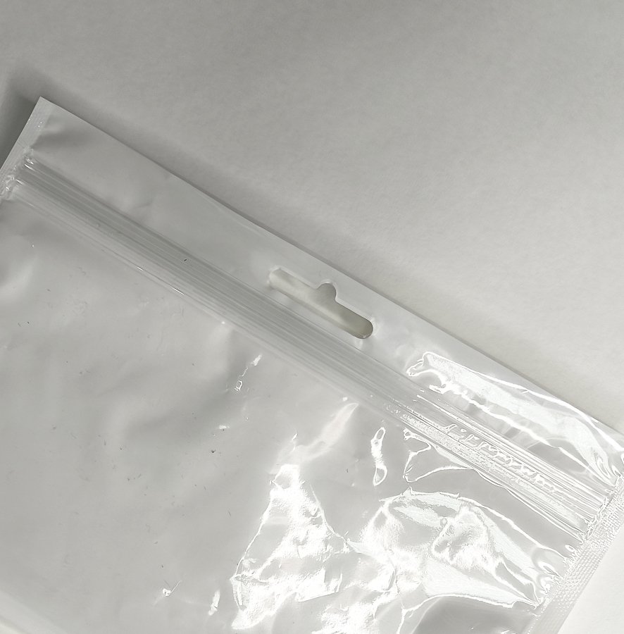 - Пакеты трехшовные ПЭТ/ПЭ (размер 180x120 мм, толщина 62 мкм) с европодвесом и замком зип-лок. Одна сторона выполнена из прозрачной пленки, вторая из белой.
