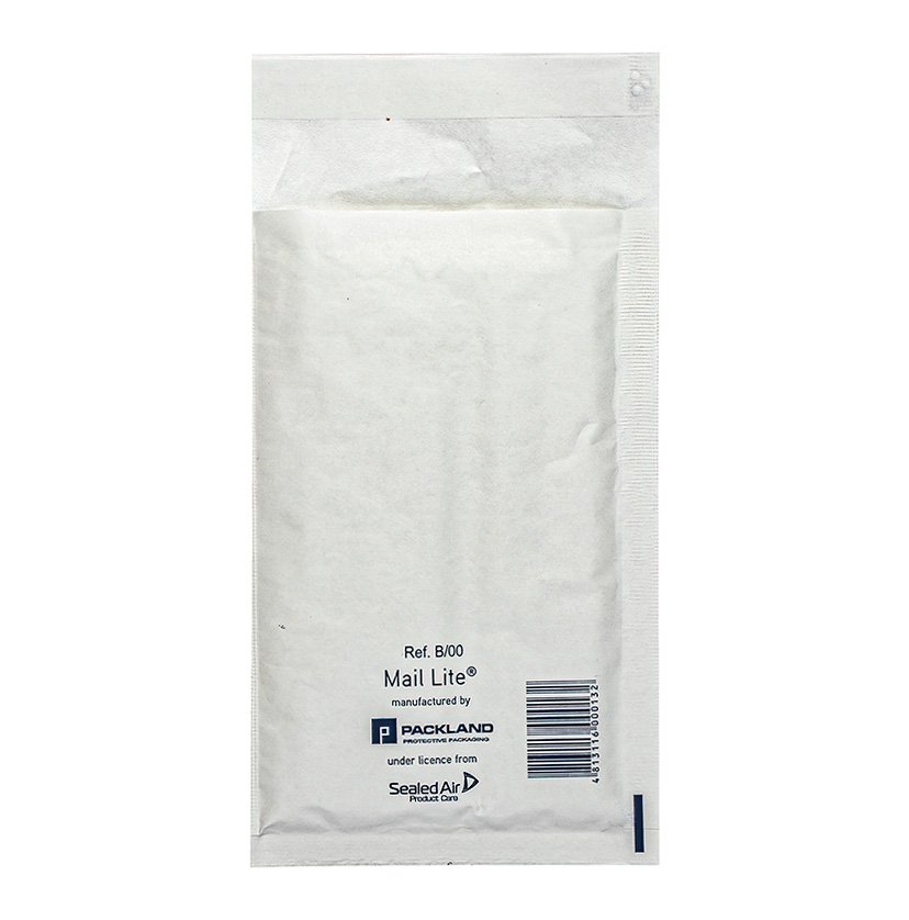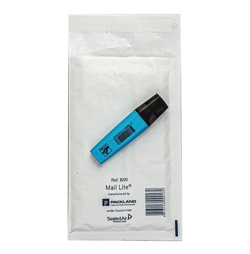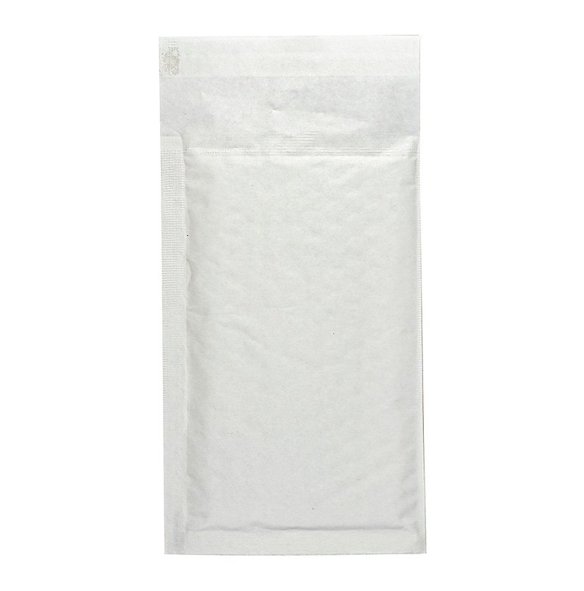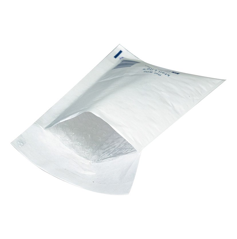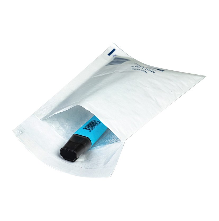 Пакет с воздушной подушкой внутри, белая бумага снаружи, на клапане отрывная лента.