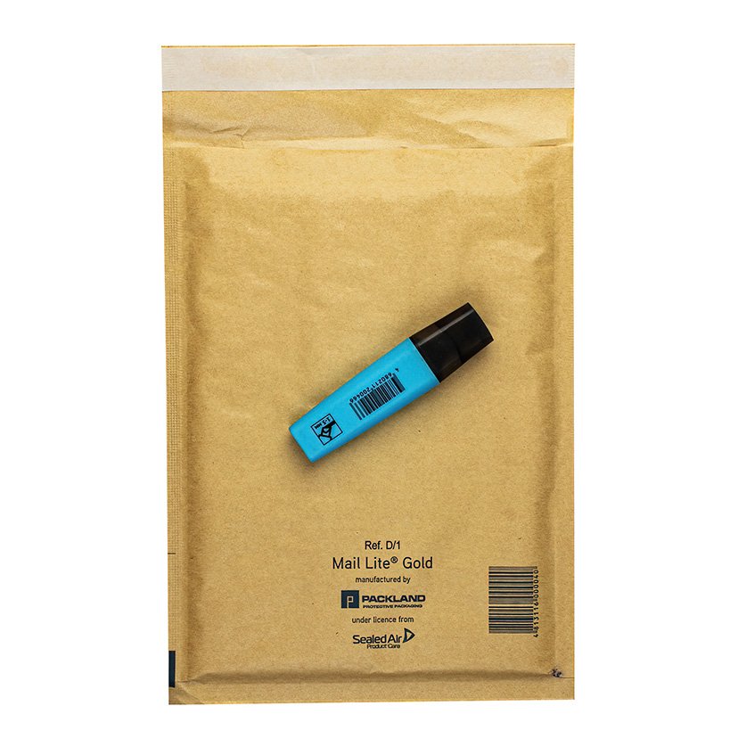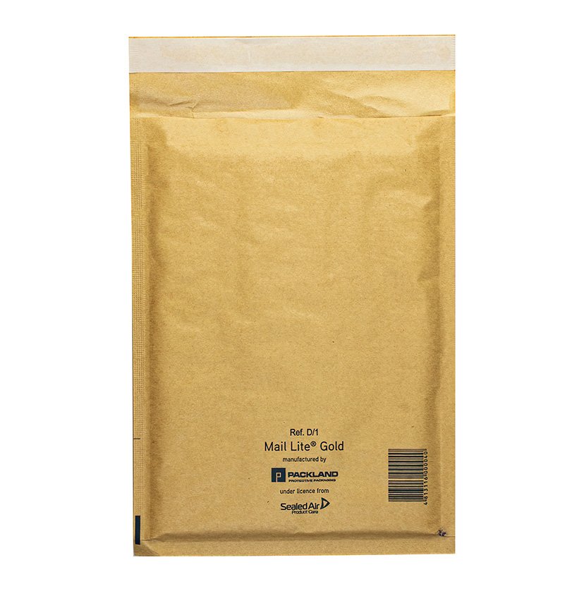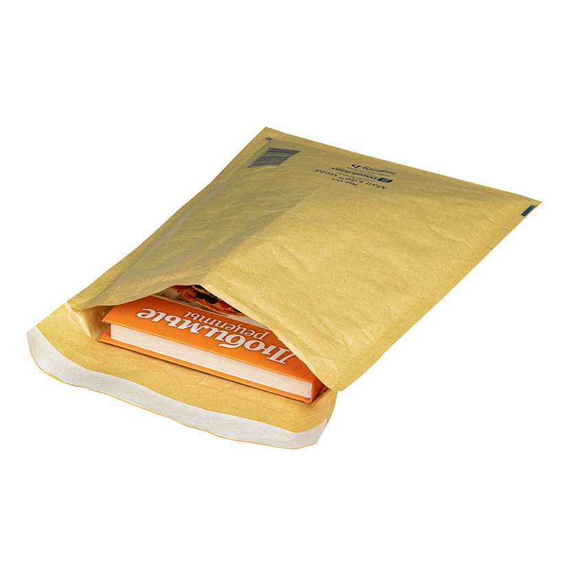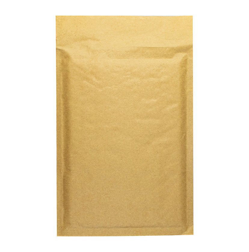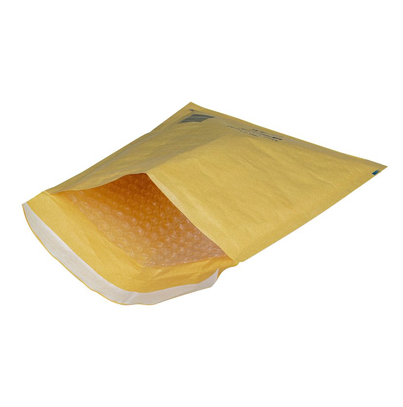Конверт с воздушной подушкой внутри, коричневая бумага снаружи, на клапане отрывная лента.