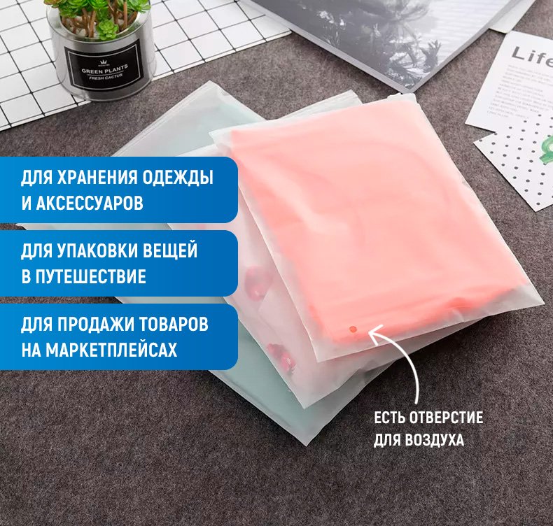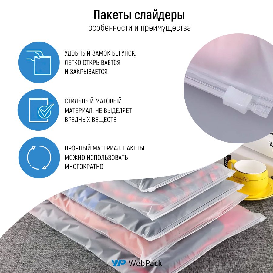 - Пакет слайдер 50х60 см с бегунком используется для упаковки, хранения и продажи одежды (футболок, рубашек, верхней одежды), текстиля и других непищевых товаров. На пакете есть отверстие для воздуха.