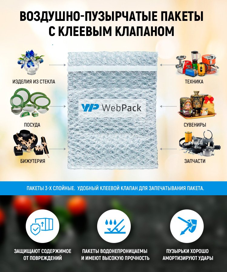 - Трехслойные воздушно-пузырчатые пакеты 30x30 см с клеевым клапаном для бережной упаковки, хранения и перевозки хрупких, бьющихся и ценных предметов (например, украшений, бижутерии, изделий из стекла, техники).