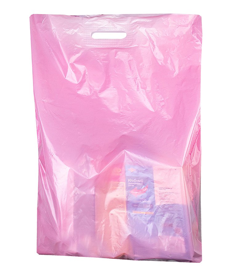 - Розовые пакеты ПВД с вырубной ручкой, размер 50x60 см (толщина 60 микрон) с донной складкой.