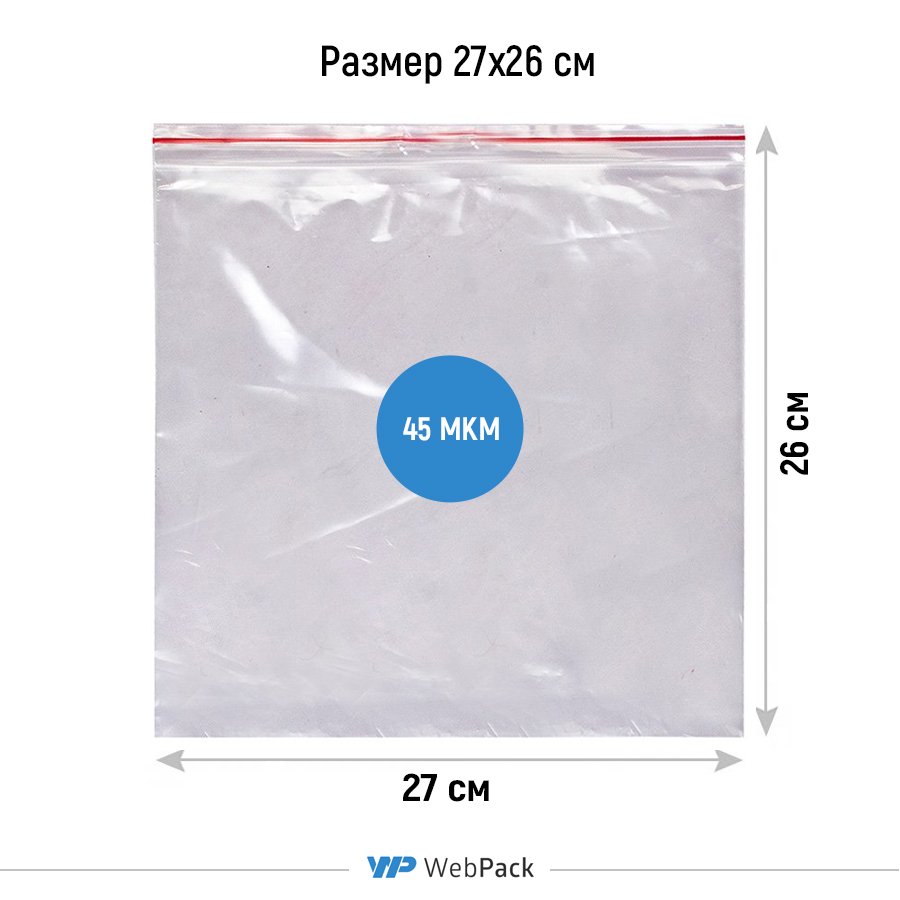 - Прозрачные пакеты с замком Зип-Лок 27x26 см, толщина 45 мкм, предназначены для фасовки, хранения и продажи штучной и сыпучей продукции.