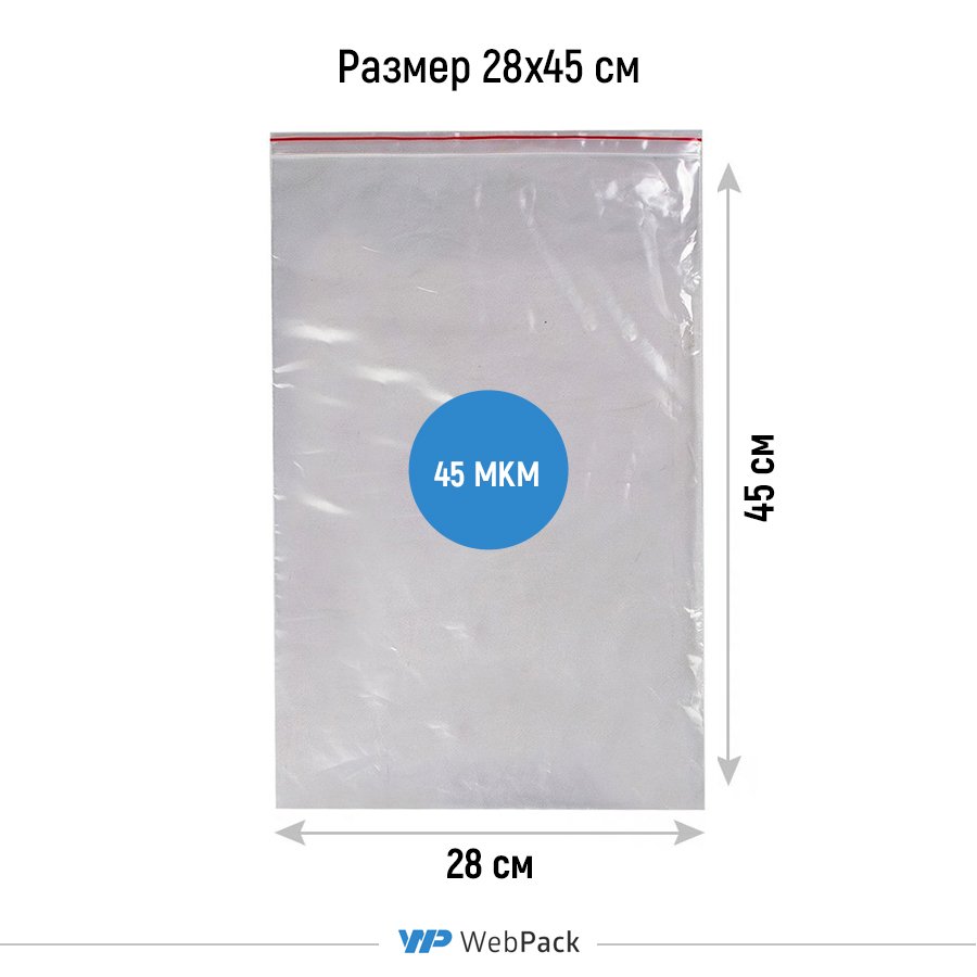 - Прозрачные пакеты с замком Зип-Лок 28x45 см, толщина 45 мкм, предназначены для фасовки, хранения и продажи штучной и сыпучей продукции.