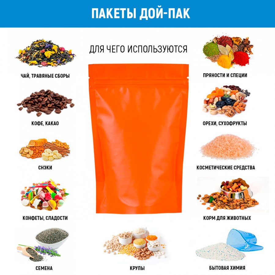 - Пакеты дой-пак оранжевые матовые, размер 135*200(+40)мм, применяются для упаковки и хранения сыпучей продукции (кофе, чай, крупа, специи, орехи, сухофрукты, сладости, снэки, морская соль, скраб для тела, бытовая химия, корм для животных и др.).