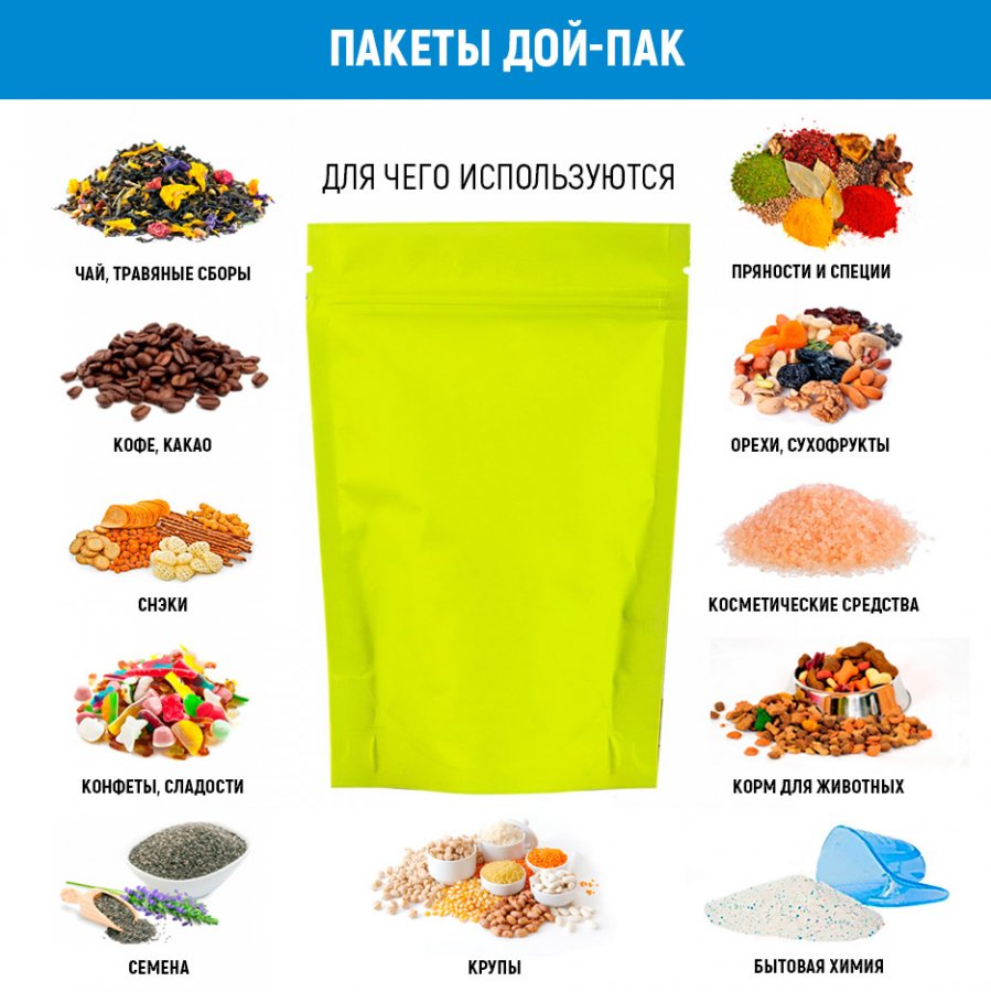 • Пакеты дой-пак салатовые матовые, размер 135*200(+40)мм, применяются для упаковки и хранения сыпучей продукции (кофе, чай, крупа, специи, орехи, сухофрукты, сладости, снэки, морская соль, скраб для тела, бытовая химия, корм для животных и др.).
