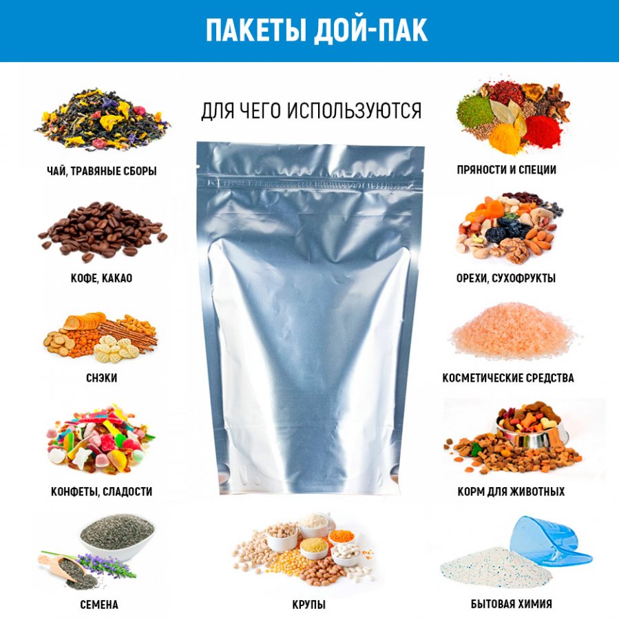 - Пакеты дой-пак серебристого цвета, размер 150*210(+40)мм, применяются для упаковки и хранения сыпучей продукции (кофе, чай, крупа, специи, орехи, сухофрукты, сладости, снэки, морская соль, скраб для тела, бытовая химия, корм для животных и др.).
