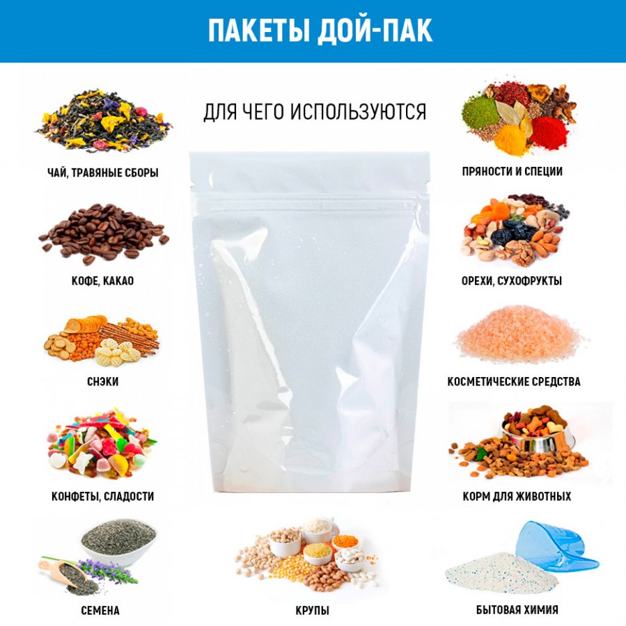 - Пакеты дой-пак белого цвета, размер 170*300(+45)мм, применяются для упаковки и хранения сыпучей продукции (кофе, чай, крупа, специи, орехи, сухофрукты, сладости, снэки, морская соль, скраб для тела, бытовая химия, корм для животных и др.).