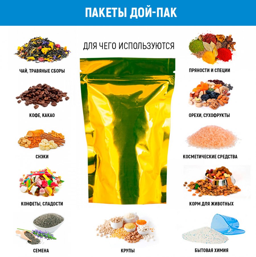 - Пакеты дой-пак золотистого цвета, размер 105*150(+35)мм, применяются для упаковки и хранения сыпучей продукции (кофе, чай, крупа, специи, орехи, сухофрукты, сладости, снэки, морская соль, скраб для тела, бытовая химия, корм для животных и др.).