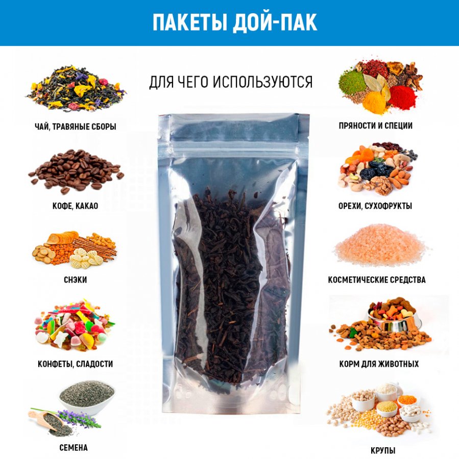 - Пакеты дой-пак 120*210(+35)мм - одна сторона прозрачная, другая - серебристого цвета. Применяются для упаковки и хранения сыпучей продукции (кофе, чай, крупа, специи, орехи, сухофрукты, сладости, снэки, морская соль и др.).