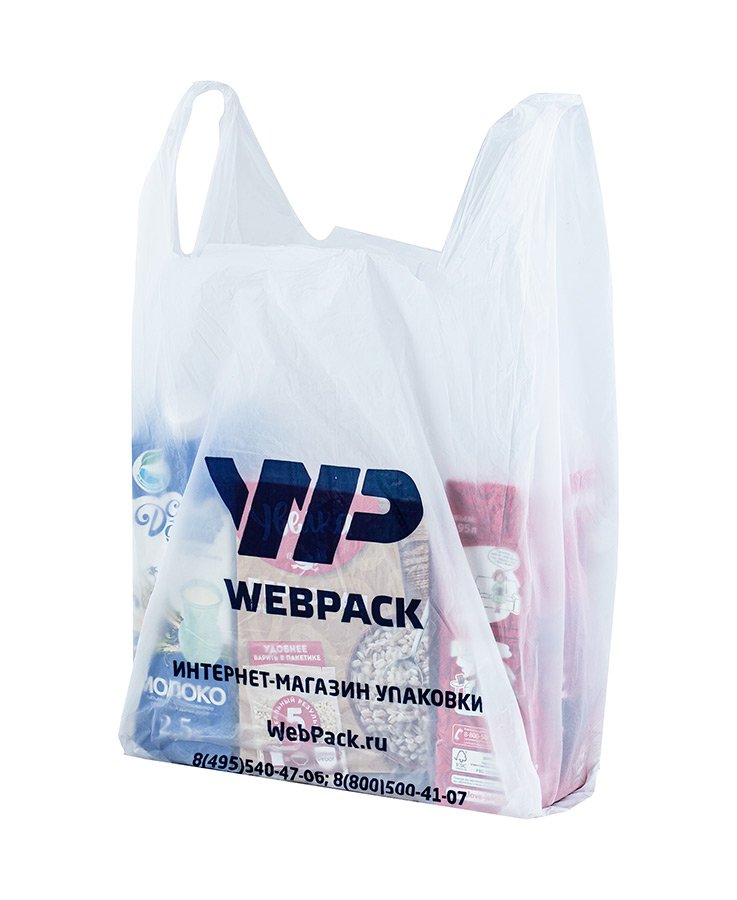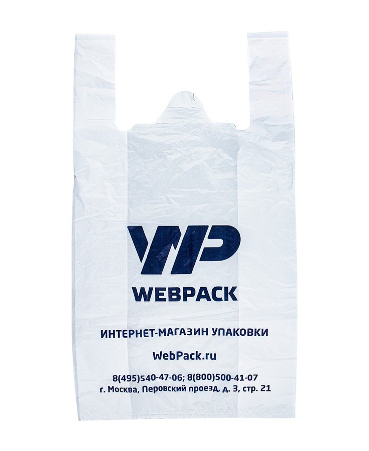 Фирменные пакеты-майка "WebPack", размер 28x50 см, толщина 20 мкм. Есть боковые фальцы. Используются в магазинах и супермакетах для упаковки различных товаров (одежды, обуви, техники, канцелярии и др.).