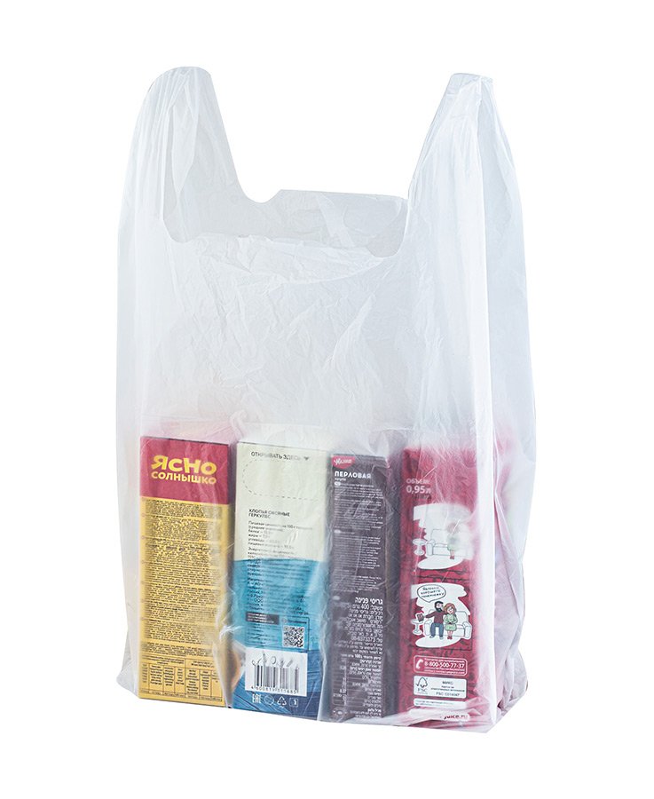 Пакеты-майка белого цвета, размер 30x60 см, толщина 22 мкм. Есть боковые фальцы. Используются в магазинах и супермакетах для упаковки различных товаров (одежды, обуви, техники, канцелярии и др.).