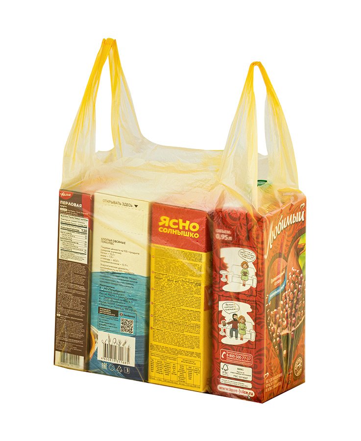 Пакеты-майка желтого цвета, размер 22,5x43 см, толщина 12 мкм. Есть боковые фальцы. Используются в магазинах и супермакетах для упаковки различных товаров (одежды, обуви, техники, канцелярии и др.).