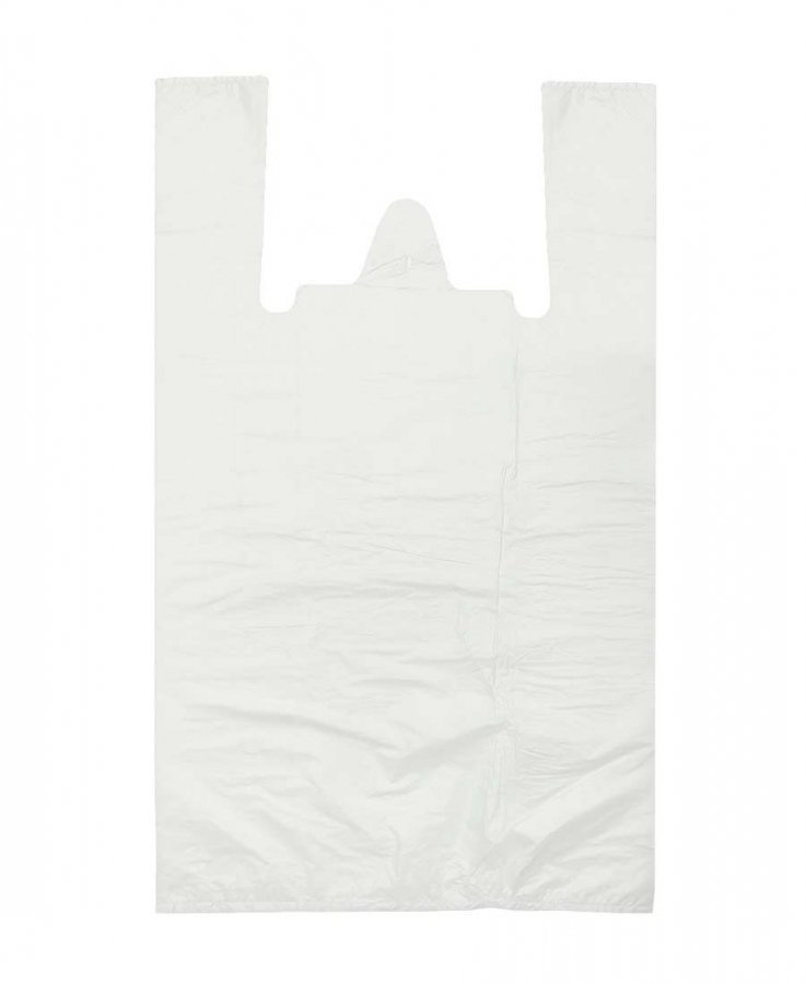 Пакеты-майка белого цвета, размер 30x60 см, толщина 15 мкм. Есть боковые фальцы. Используются в магазинах и супермакетах для упаковки различных товаров (одежды, обуви, техники, канцелярии и др.).